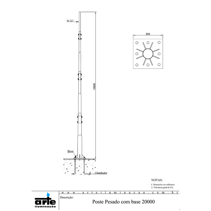 >> Poste Pesado com Base / Poste Pesado com Base 20 Metros Dimensões em milímetro Tolerância geral 2% Sem escala Material em aço 1010/1020