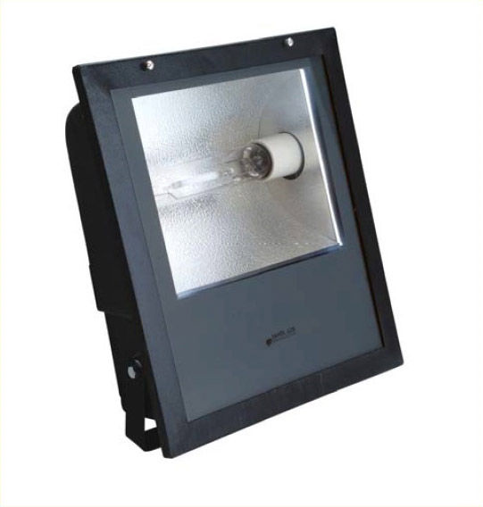 Projetor para iluminação especifica fechado para uso intemo e externo, para 1 lâmpada. Corpo com alojamento em alumínio fundido. Refletor simétrico em chapa de alumínio stucco. Difusor em vidro plano temperado transparente.