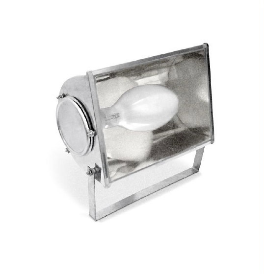 Projetor para iluminação especifica fechado para uso interno e externo, para 1 lâmpada. Corpo refletor simétrico em chapa de alumínio brilhante, laterais em chapa de aluminio. Manutenção lateral por uma canopla fixada e selada. Difusor em vidro plano temperado transparente.